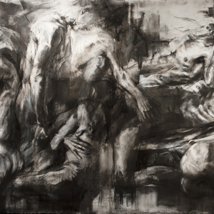 Interdependence, as represented here, recreates about a 7 foot section of a 27-foot drawing, made over three months on a continuous roll of paper, using live models, gesso, charcoal, and rust washes.